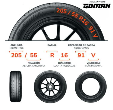 - Leer el lateral del Neumático, tomando las medidas tanto (Ancho, Altura y Diámetro) También (Índice de carga y velocidad) Este factor puede variar dependiendo los Neumáticos que necesita tu vehículo.